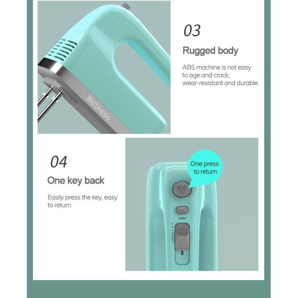 New product appearance design: streamlined humanized design, can be placed upright; circuit board 5 speeds, from low to high, easy to meet all kinds of mixing needs; equipped with two 304 stainless steel rods + two 304 stainless steel powder rods + two 304 stainless steel wire rod, whole egg, batter, ice cream, butter, kneading and other operations; equipped with 400W pure copper motor, low sound, strong power, durable.